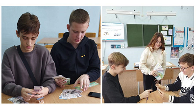 Школьники выполнили практическое задание: подсчет денежных купюр и монет, составление Акта инвентаризации денежных средств. Для выполнения задания им был выдан сейф, купюры, ручки, калькулятор, бланки. Так же учащимся было дано задание — рассмотреть купюры разного номинала, отличить фальшивые от настоящих и назвать признаки подлинности купюр.
