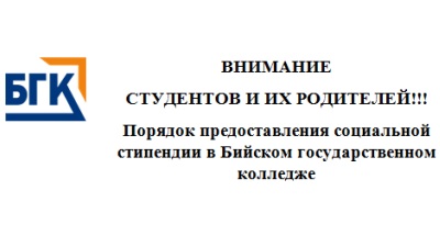 Порядок предоставления социальной стипендии в Бийском государственном колледже регламентируется Положением о стипендиальном обеспечении и иных формах социальной поддержки обучающихся колледжа. Размер социальной стипендии – 930,35 рублей. Заявл ...