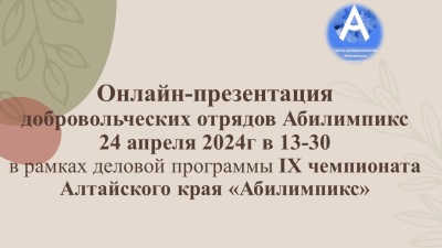 В рамках деловой программы IX чемпионата Алтайского края «Абилимпикс» на базе Центра добровольчества «Абилимпикс» в Алтайском крае в дистанционной форме в 13.30 часов 24 апреля 2024 года пройдет онлайн-презентация отрядов добровольцев, сопрово ...