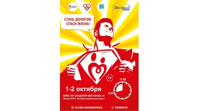 Объявлен старт ежегодной акции «Стань донором! Спаси жизнь!». Ежегодная социальная акция, направленная на популяризацию донорского движения и здорового образа жизни среди обучающейся и работающей молодежи городов Барнаула, Бийска, Рубцовска и ...