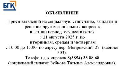 ОБЪЯВЛЕНИЕ Прием заявлений на социальную стипендию, выплаты и решение других социальных вопросов в летний период осуществляется с 11 августа 2025 г. по вторникам, средам и четвергам с 10.00 до 15.00 по адресу пер. Мопровский, 27 (кабинет ...
