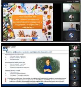 1. «Арт‑терапия как инструмент коррекции деструктивного поведения у студентов: от агрессии к творчеству». В рамках доклада педагогом-психологом Светланой Вагнер представлен метод перевода агрессивной энергии учащихся в созидательное русло через творческие занятия.