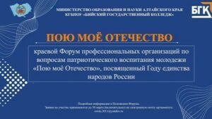 В рамках краевого Форума патриотического воспитания «Пою моё Отечество», посвященного Году единства народов России прошел конкурс педагогических проектов «Воспитание: перезагрузка». Организатором выступил Бийский государственный колледж в соответствии с планом работы Совета директоров ПОО Алтайского края.